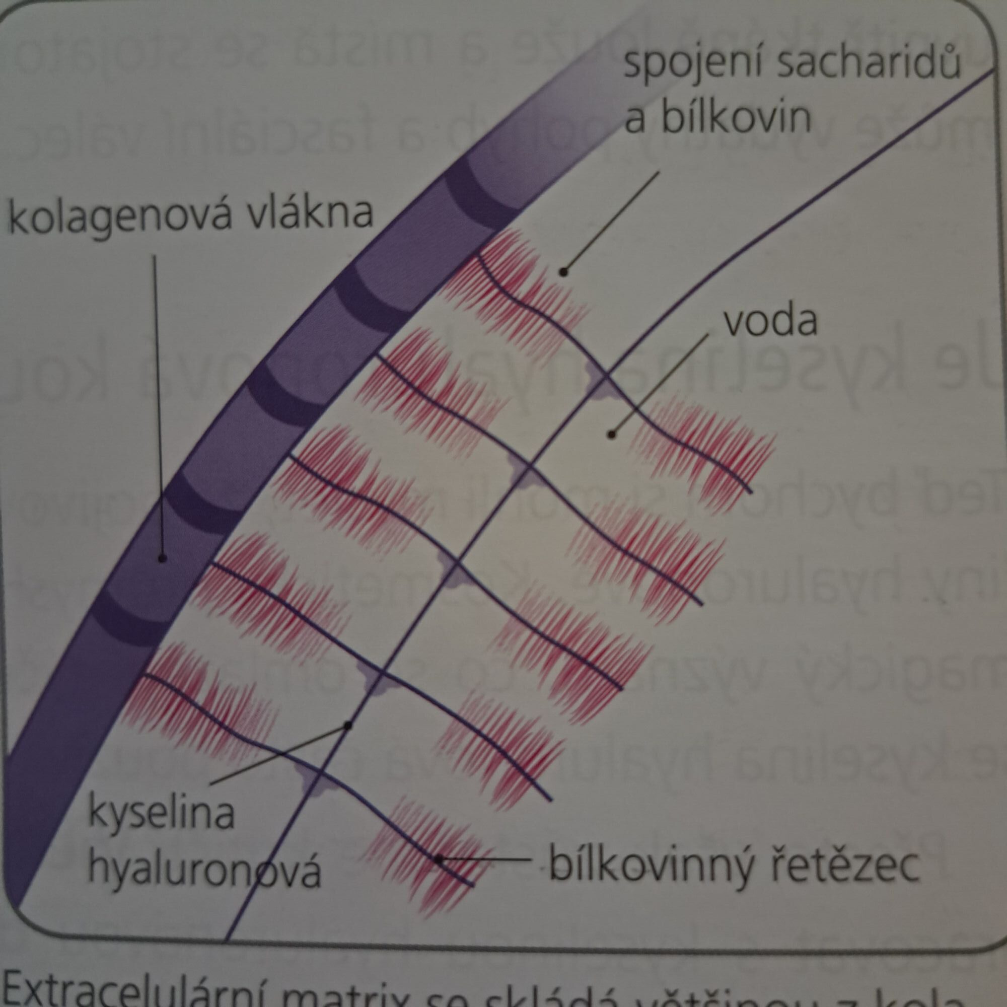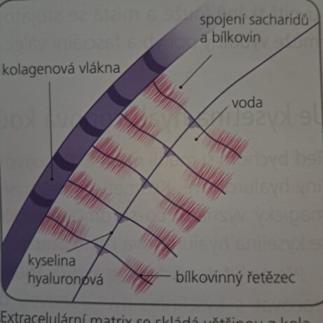 Na kolagenových vláknech se nachází řetězec kyseliny hyaluronové a na něj jsou navázané stejně hydrofilní sloučeniny sacharidu a bílkoviny. Tyto struktury vypadají jako malé kartáče na mytí lahví, jejich štětiny se rozkládají do vějíře a vážou vodu.