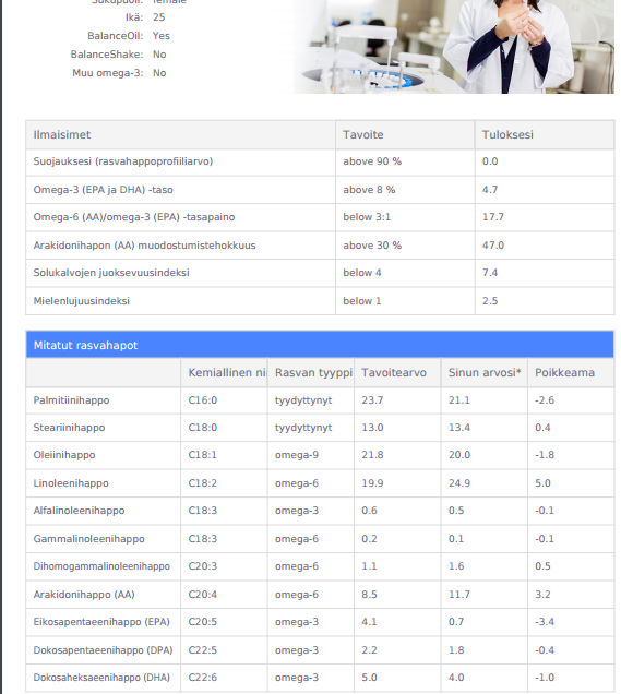 Test zkoumá 11 mastných kyselin, které tvoří zhruba 98 % veškerých mastných kyselin v krvi včetně nasycených, mononenasycených (omega-9) a polynenasycených (omega-6 a omega-3) mastných kyselin.