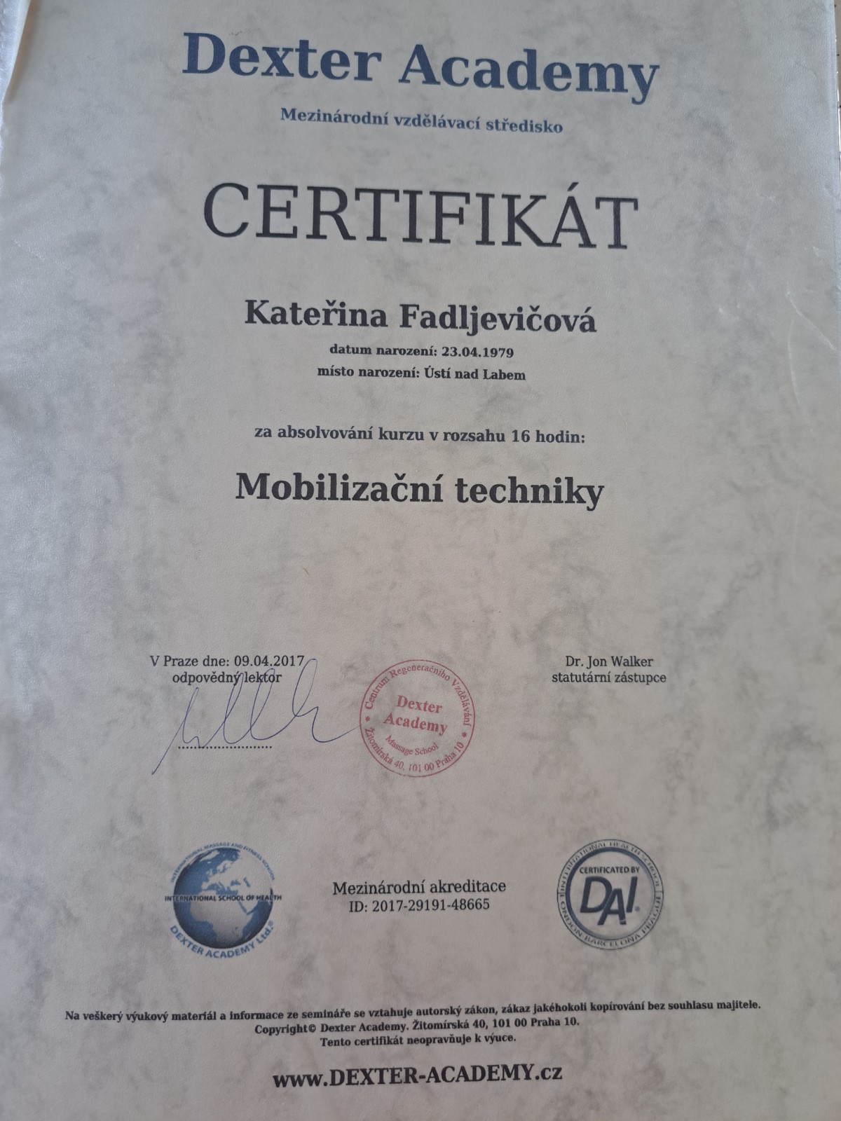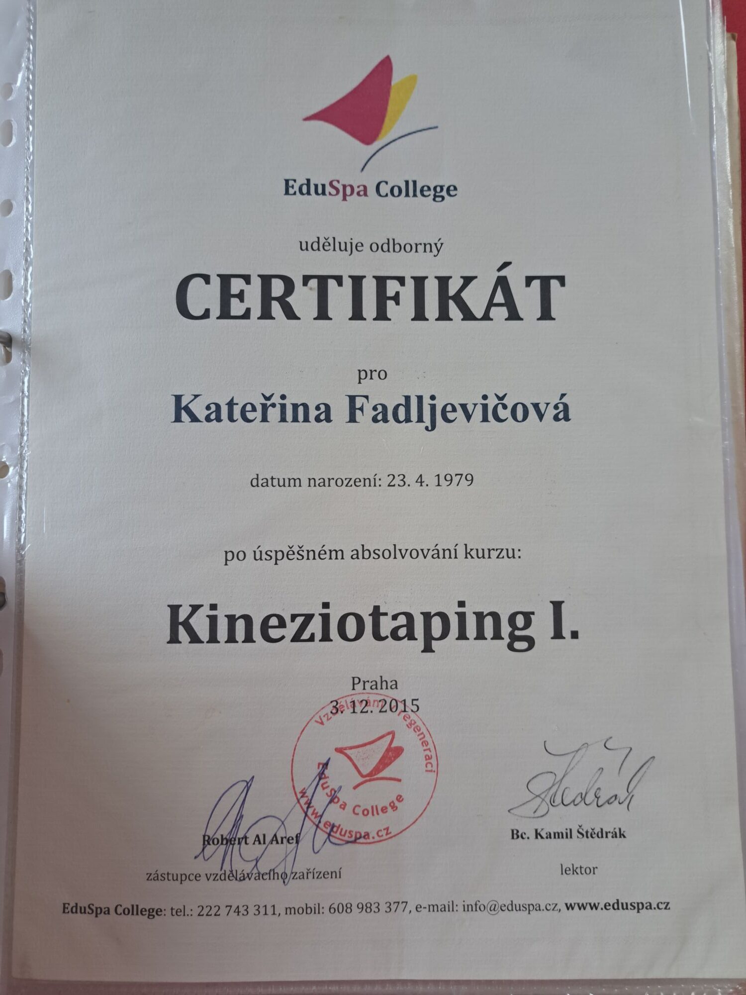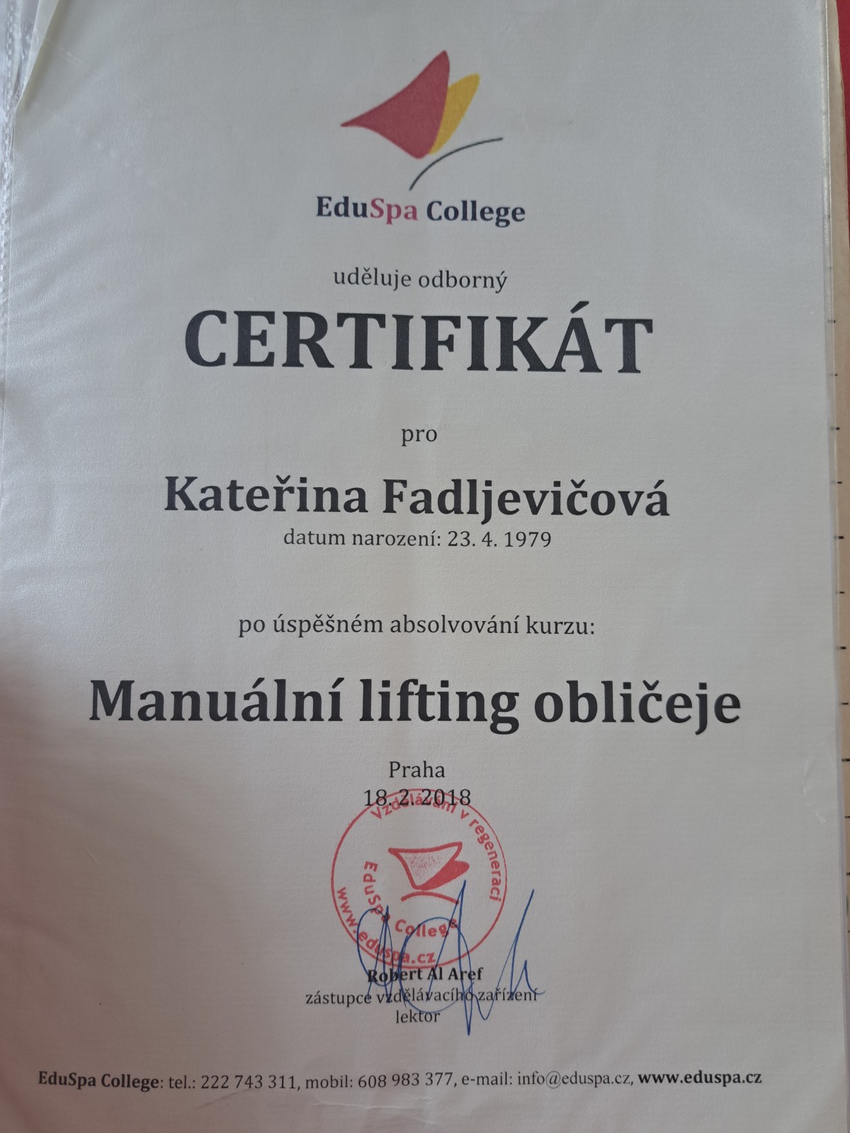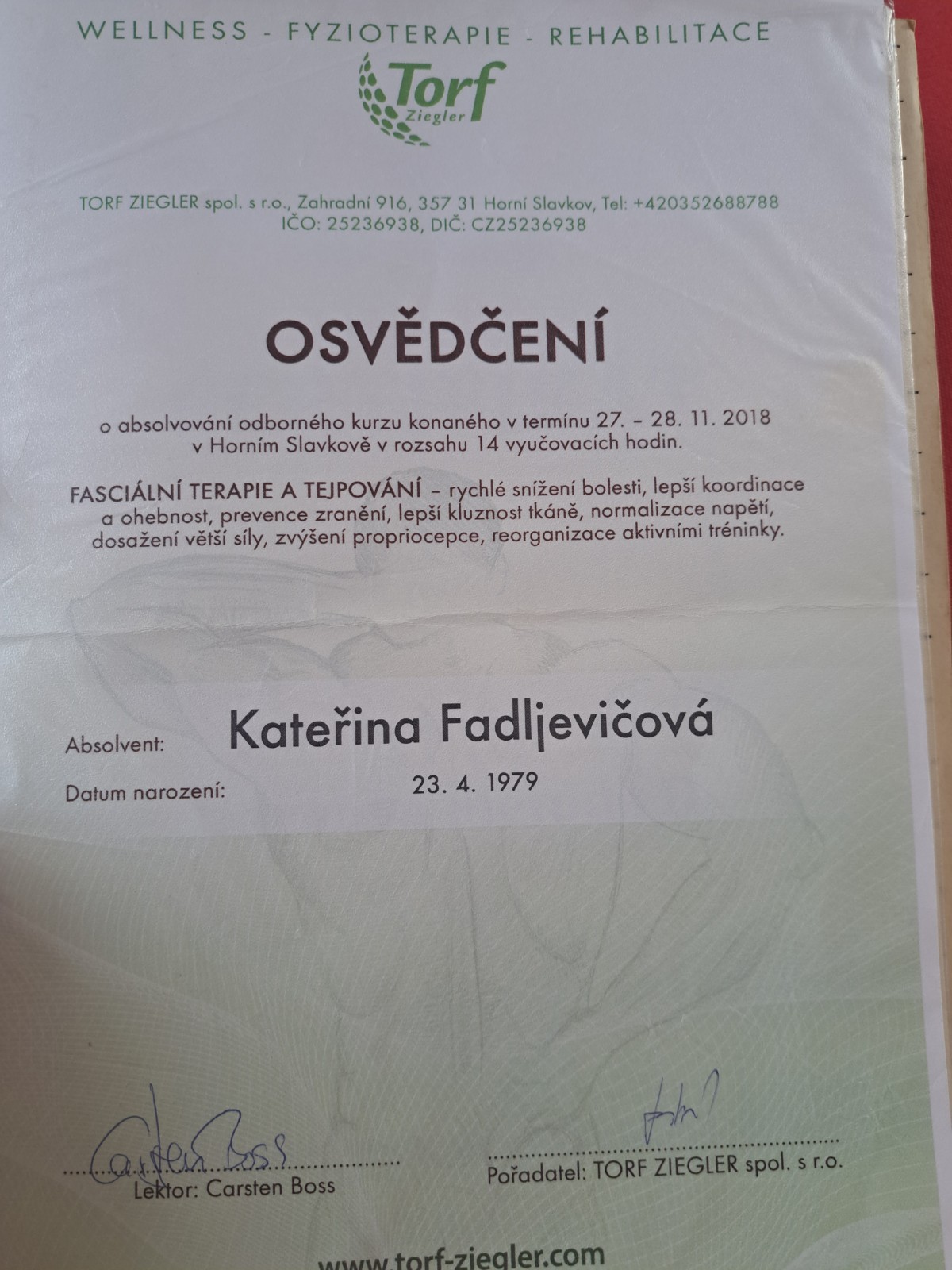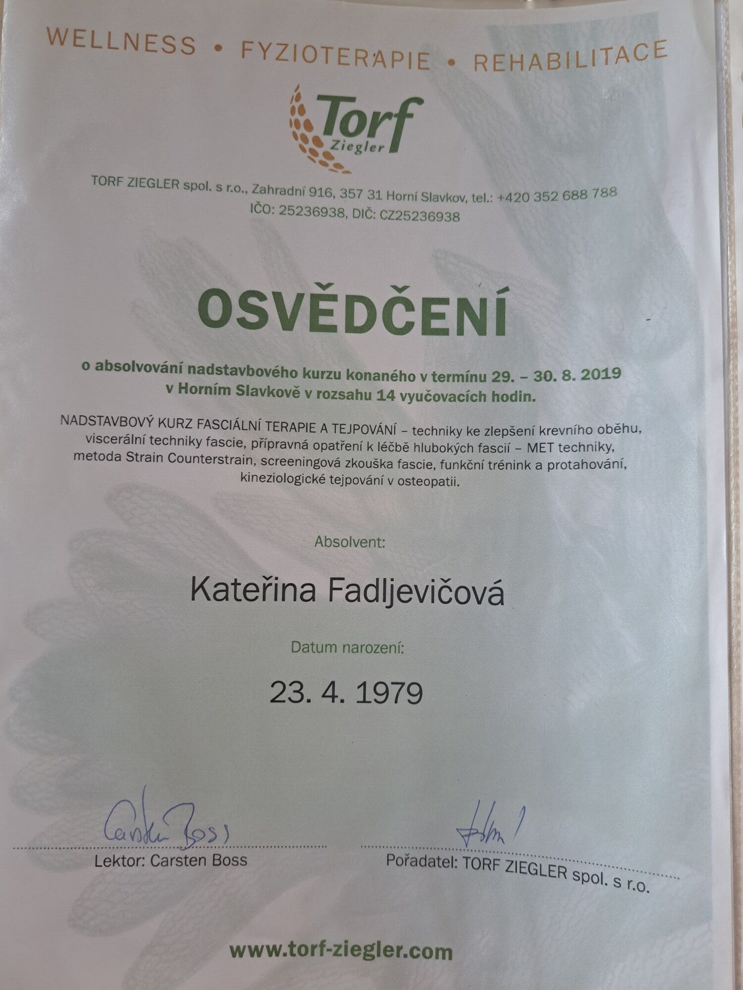 - Základní kurz a Nadstavbový kurz Fasciálí terapie & tejpování (Kineziologie v oblasti osteopatie, Léčba hlubokých fascií - MET techniky, Fasciální terapie - viscerální techniky a tejpování II, Fasciální terapie a tejpování I, Flossing PINO@GmbH, Strain-Counterstrain metoda)